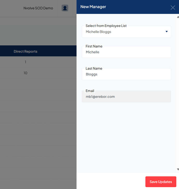 Click the 'New Manager' button to begin the process of adding a new manager. From the dropdown menu, choose the employee you would like to designate as a manager. Once you've made your selection, click the red 'Save Updates' button to complete the addition of the new manager. Note: It is essential for the employee to have an email address linked to their account in order to successfully add them as a manager.