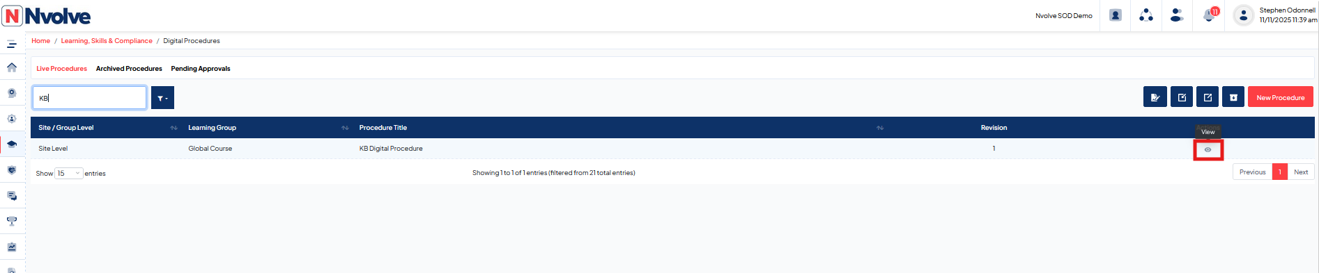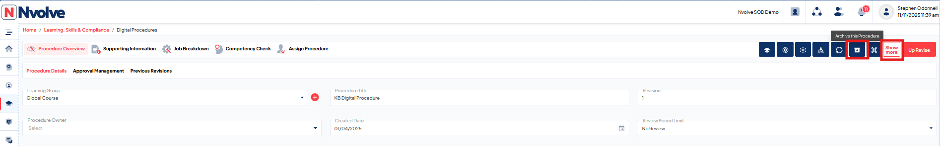 Note: For instructional purposes, this walkthrough demonstrates how to archive a Digital Procedure. The process outlined here also applies when archiving other available training types within the platform.