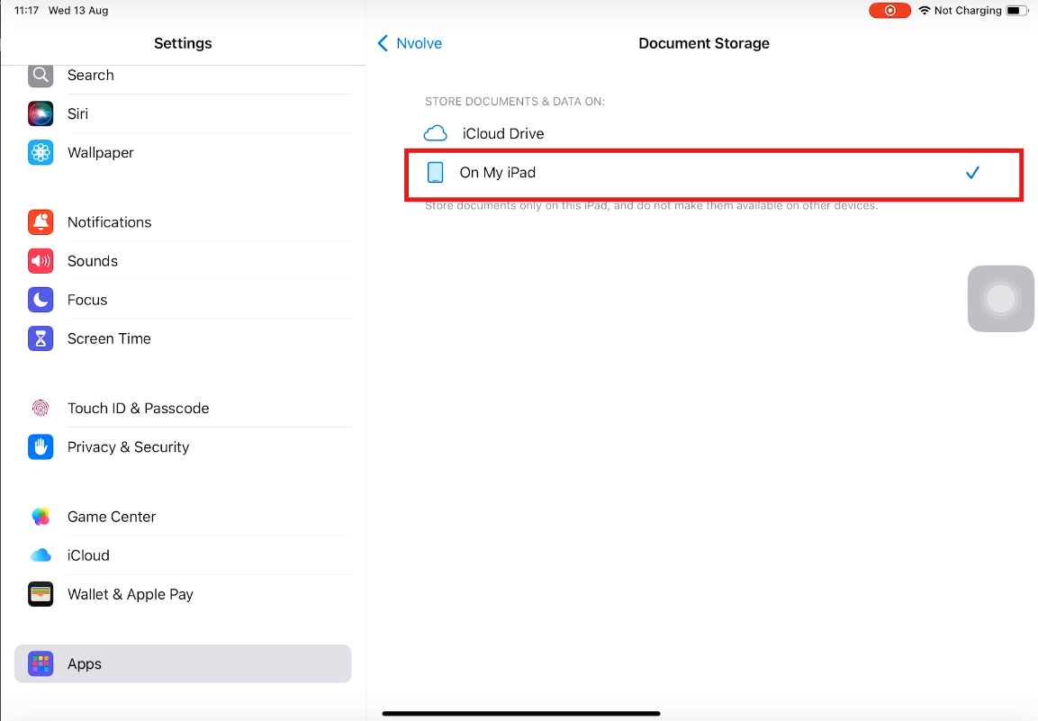 Turning off iCloud Storage for the Nvolve app on iPad.