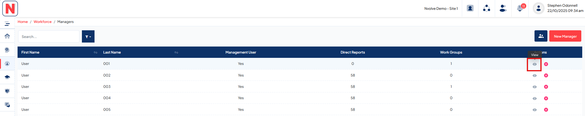 Next click on the eye icon of the manager you wish to assign direct reports to.