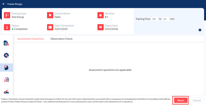 From here, tap ‘Reset’ to reinstate the Grace Period for the selected training. If the employee is ready to complete the training, you can have them sign off to update the training status—simply tap ‘Save’ after their sign-off. Alternatively, if you only wish to refresh the training to the Grace Period without requiring a new sign-off, tap ‘Reset’ followed by ‘Save’.